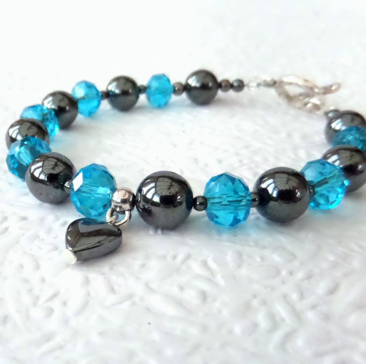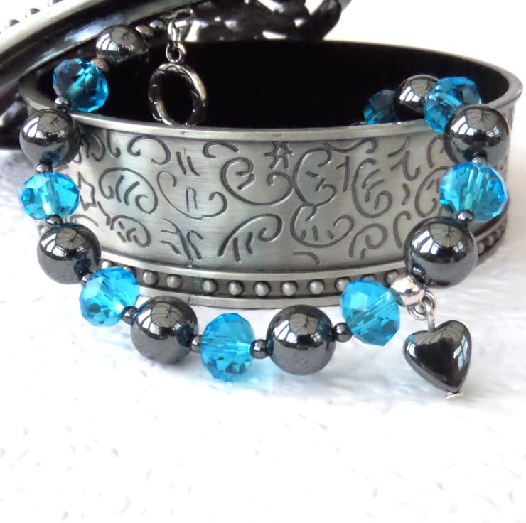 I have alternated it with a lovely shade of blue crystal in this bracelet, and added a pretty little hematite heart charm to give additional detail