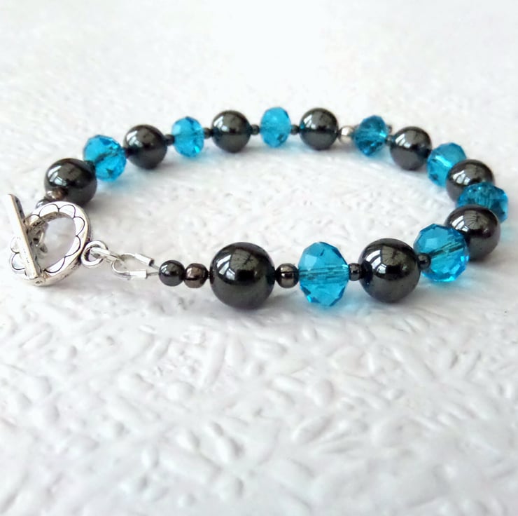 Faceted pretty blue crystal looks great with polished hematite in this unique bracelet.