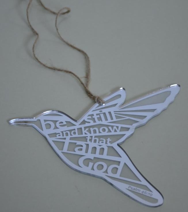 A laser-etched bird that can be hung indoors or outdoors as an eye-catching garden decoration.