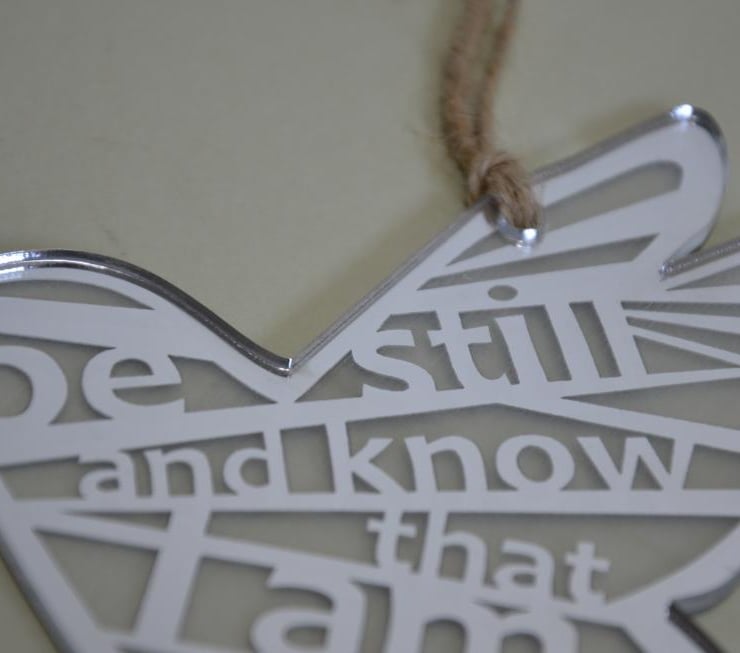 I reverse-etch my design onto the back of a sheet of mirrored acrylic, laser cut them out and attach twine. The text reads: