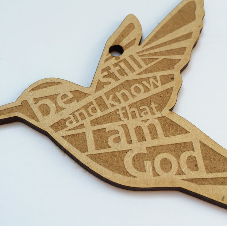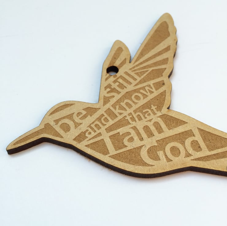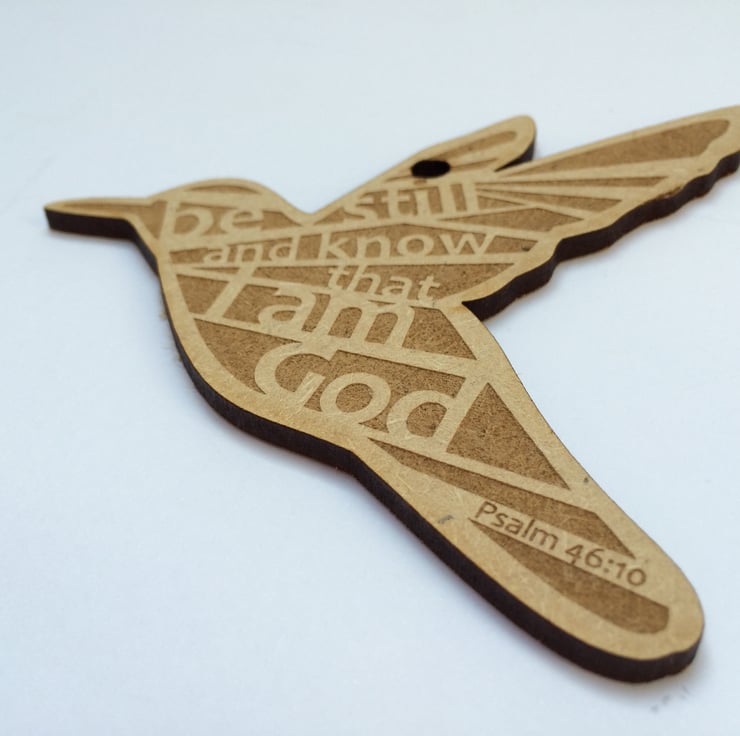 I etch my design onto a sheet of laser-grade MDF, cut them out and attach twine. The text reads: