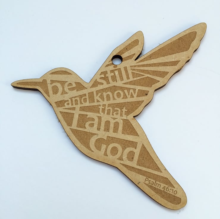 A laser-etched bird that can be hung indoors or outdoors as an eye-catching garden decoration.