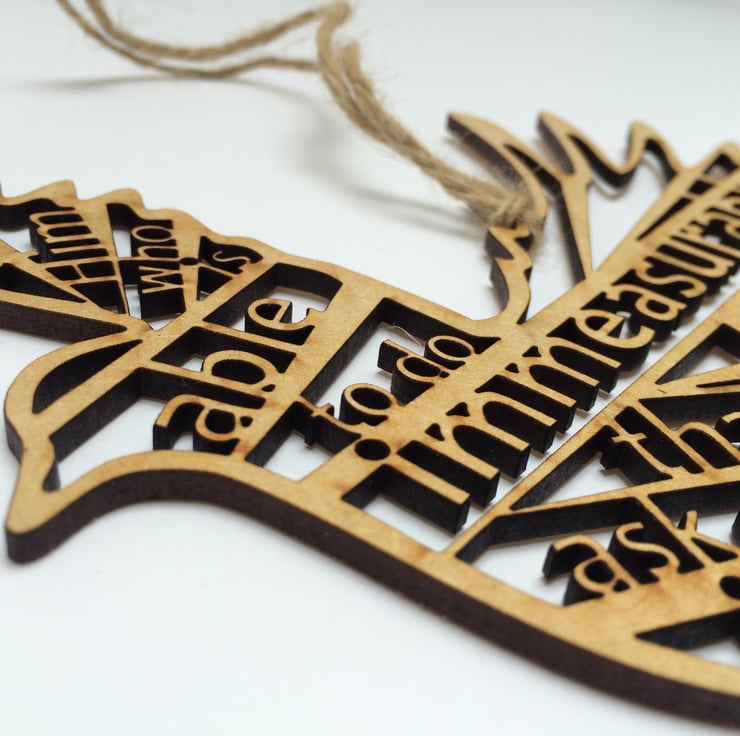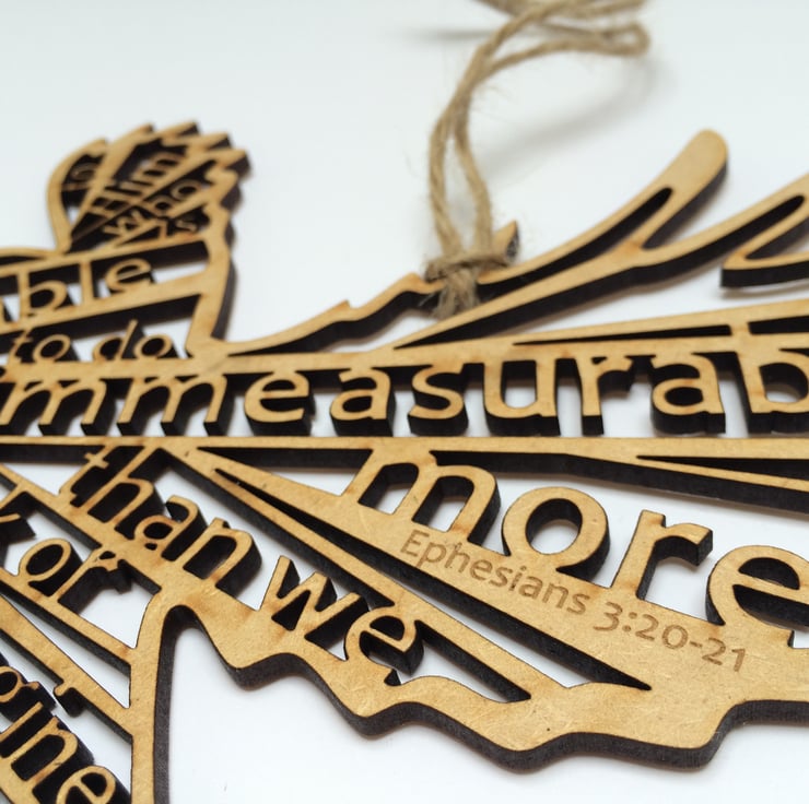 I cut my design from a sheet of laser-grade MDF and attach twine. The text reads: