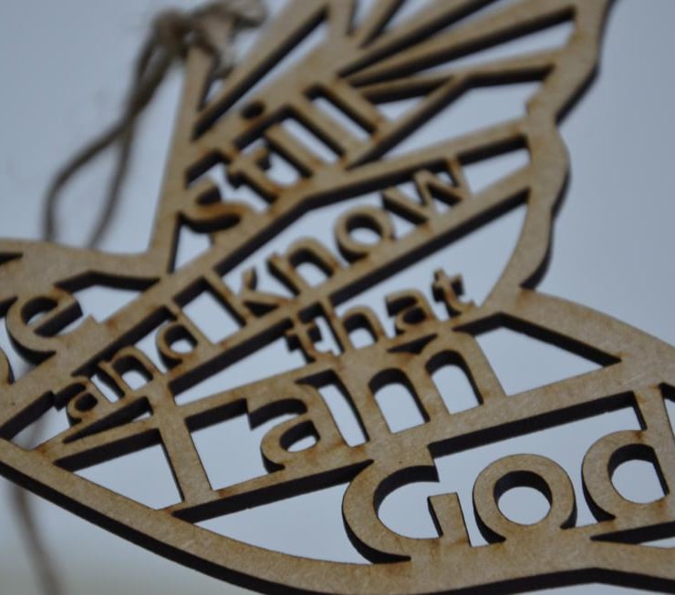 I cut my design from laser-grade MDF and attach twine. The text reads: