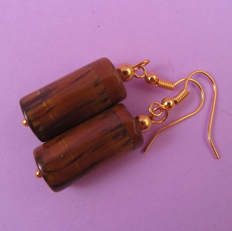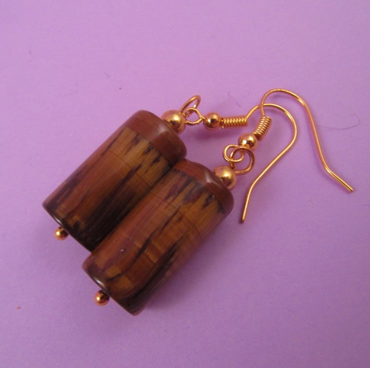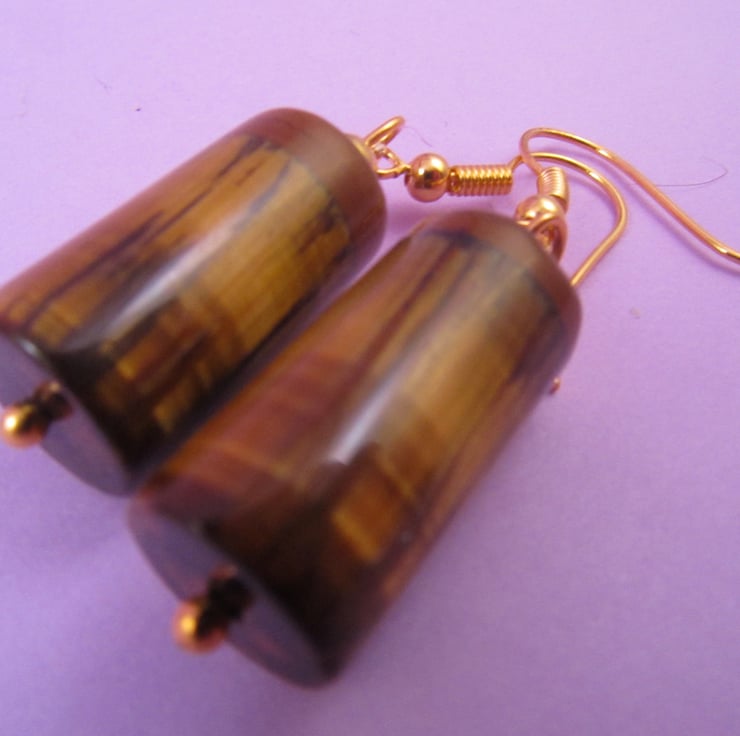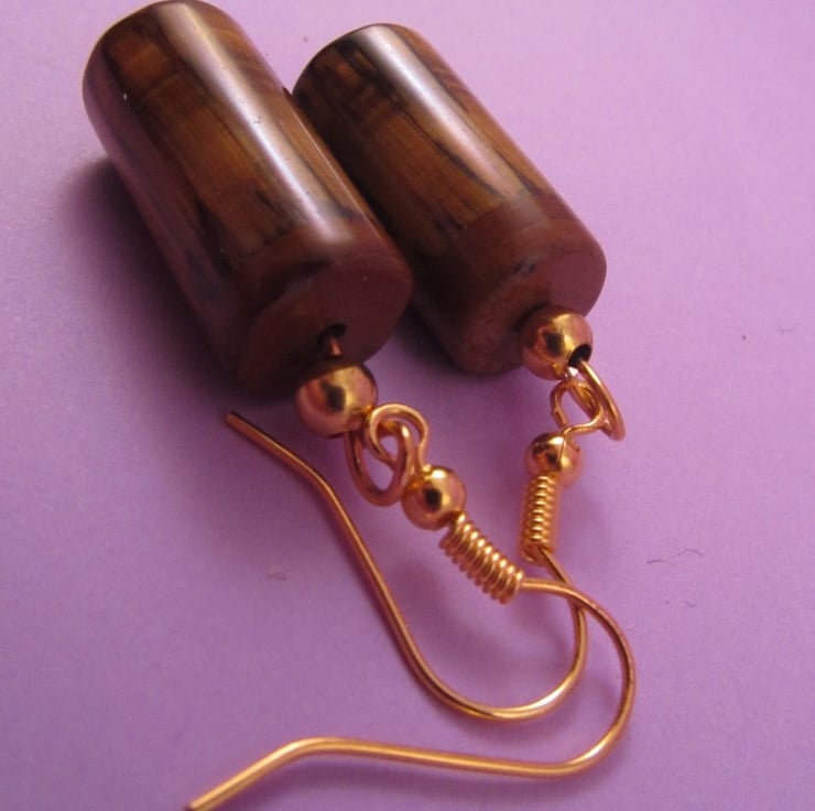 This is a pair of amazing brown tigers eye tube dangle earrings. They are created with real Tigers Eye gemstones, and gold plated e-coated copper. These are great for every day wear, and really shine.