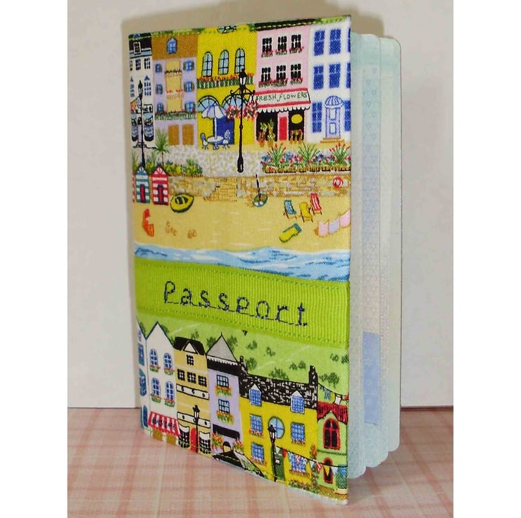 A fun passport cover, made from fabric featuring a beach scene with beach huts, and pretty buildings, with a lime green ribbon, with the word "passport" machine stitched on. This is really cheerful, and would brighten up any journey. It is fully lined, and interfaced to protect your passport. It fits a standard UK passport.