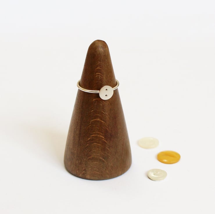 The little button measures 7mm in diameter. I've drilled 2 holes into the silver to give the appeareance of a button and soldered this to a ring shank made from 1.2cm thick silver wire.