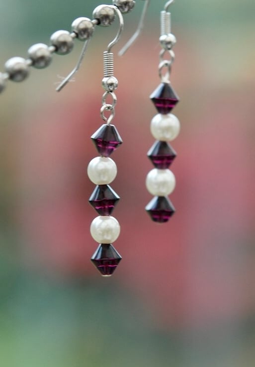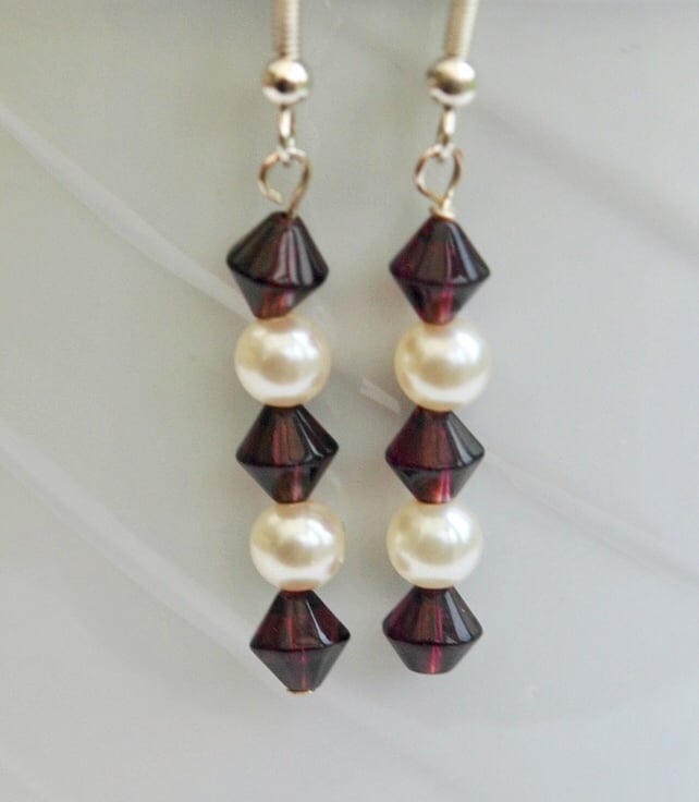 These pretty dangly earrings feature faux pearls and ruby crystal bicone beads suspended from silver-plated ear-hooks. They catch the light beautifully and would be great for parties - perfect as a Christmas stocking filler.
