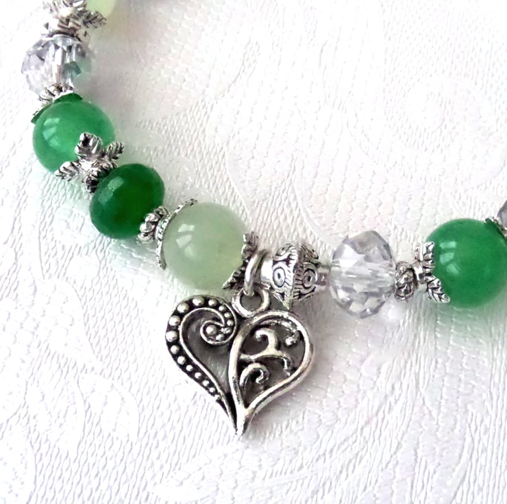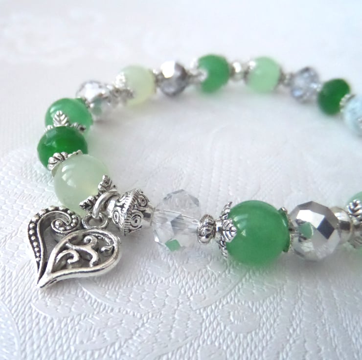 A unique bracelet, made with a beautiful mix of gemstones in lovely shades of green, contrasting with silver and clear crystal.
