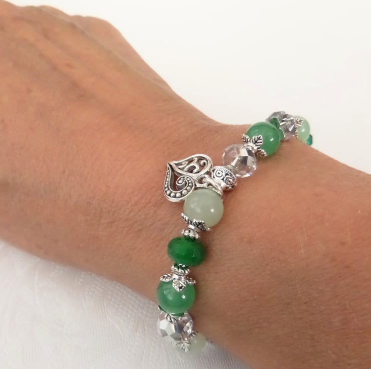 This gemstone bracelet is made with a mix of colours and stones - various shades of green jade, aventurine and agate, silver crystals and tibetan silver beads.