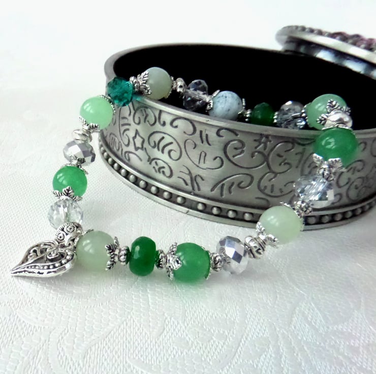 A unique bracelet, made with a beautiful mix of gemstones in lovely shades of green, contrasting with silver and clear crystal.