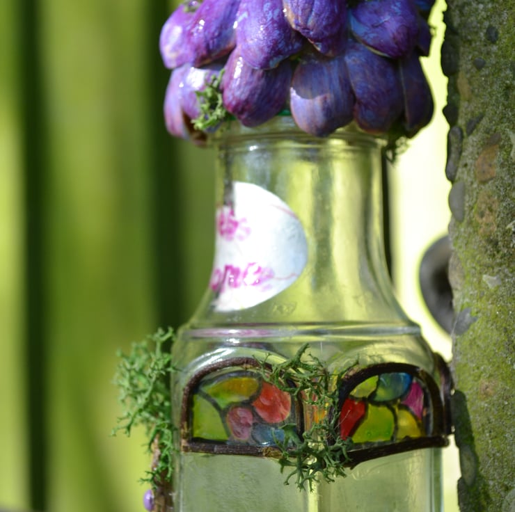 Handmade to delight woodland folk and fairies alike. This magical little fairy house in a jar measures 15 cm high and 6 cm wide. The house has a lovely little door, domed stained glass windows framed with twigs with odd touches of moss here and there. It has a lovely tiled roof, made with pistachio nut kernels, which can screw on and off. Any of the woodland folk would call this amazing enchanted little fairy house their home and it can be put anywhere in your house or garden.
