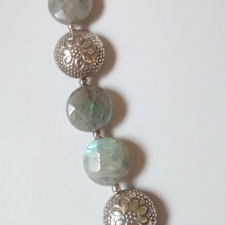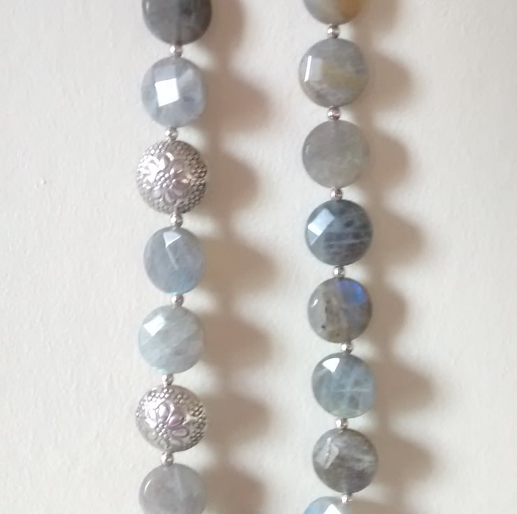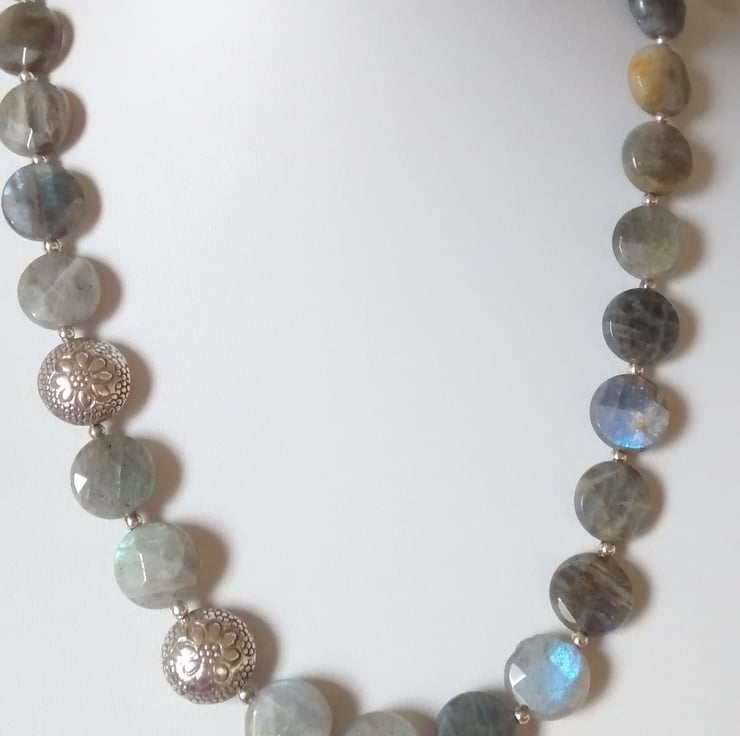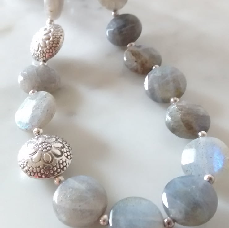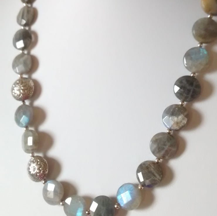 This is a statement necklace of Labradorite Faceted Puff Coins that have lovely blue and grayish green tones that shine through like flashes of lightning.