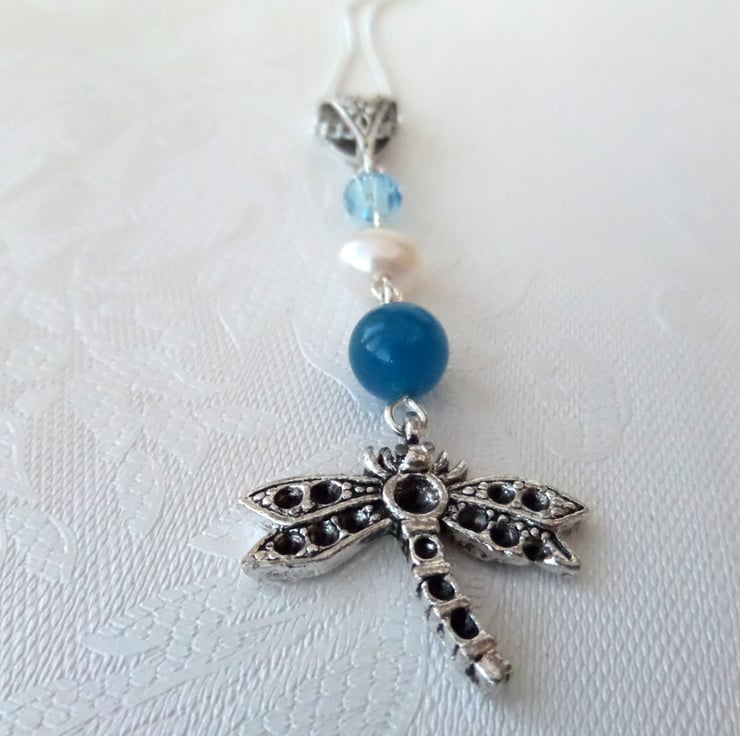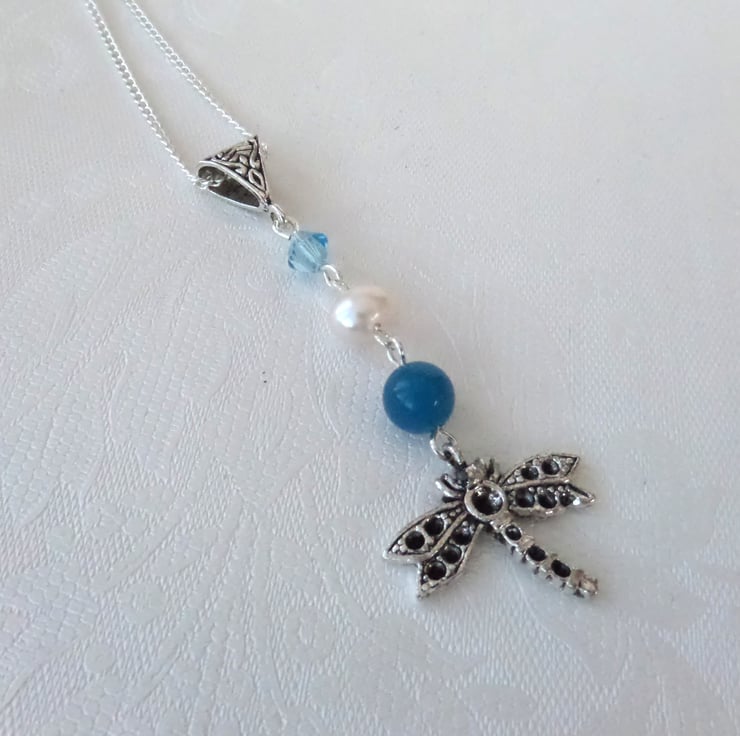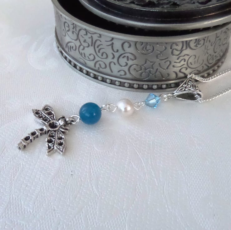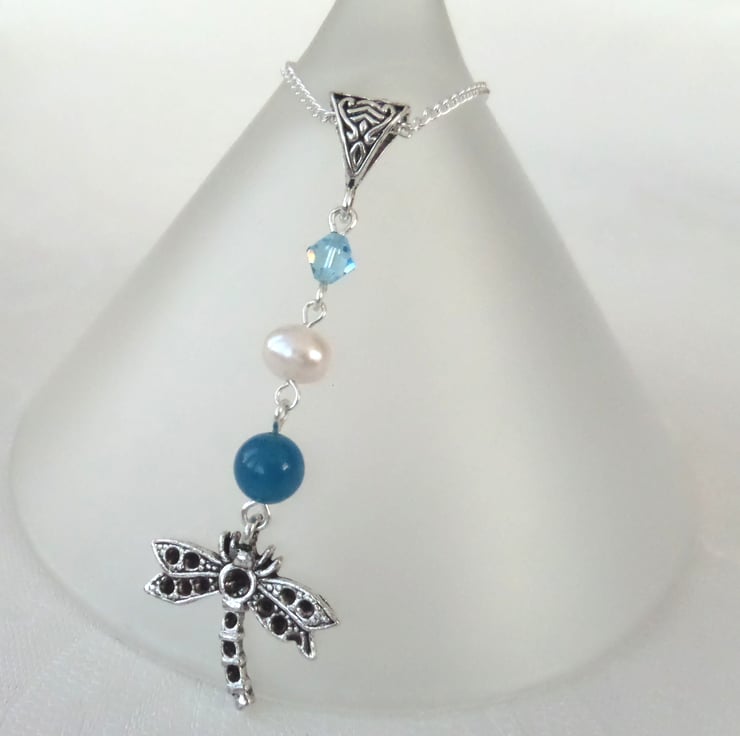 A unique necklace, featuring a beautiful tibetan silver dragonfly charm, a single white pearl, blue apatite and a delicate blue crystal by Swarovski®.
