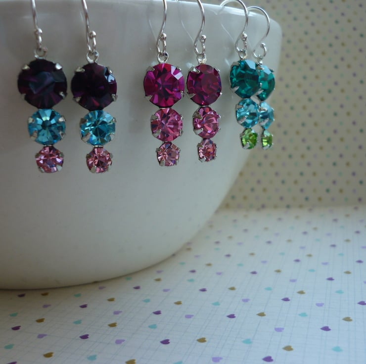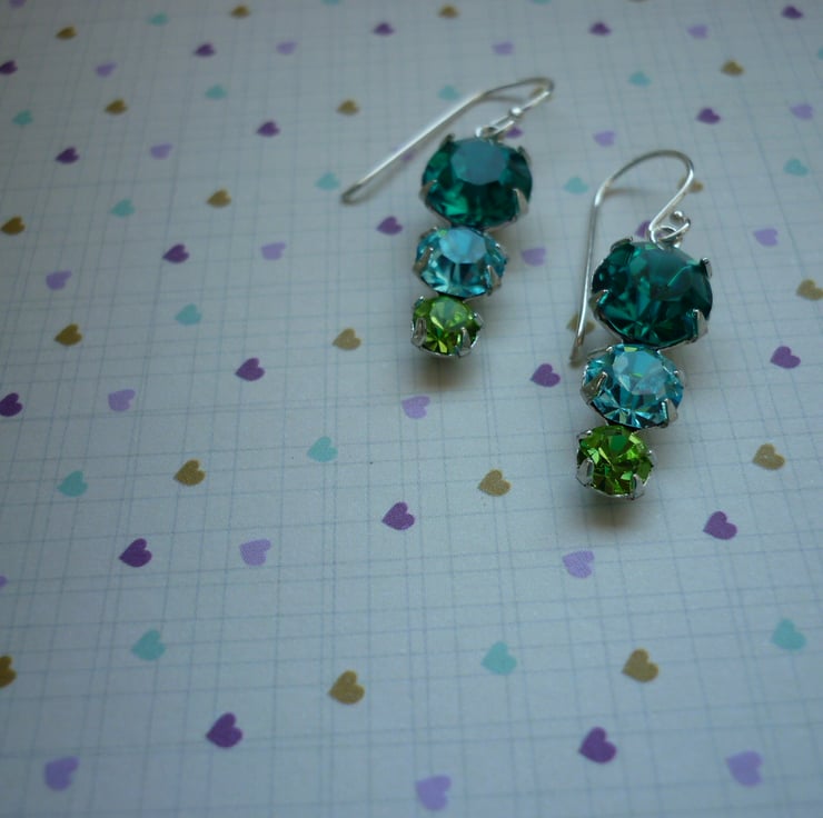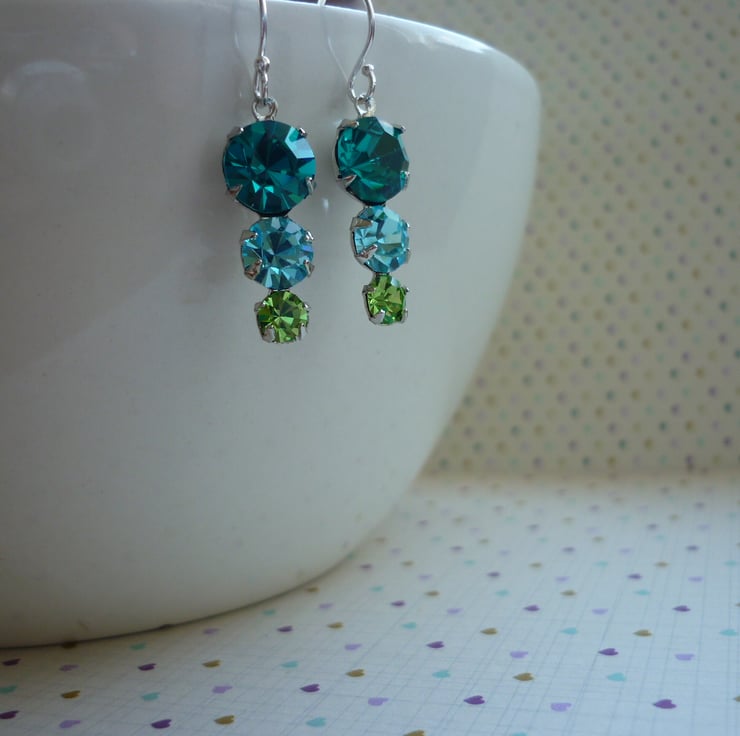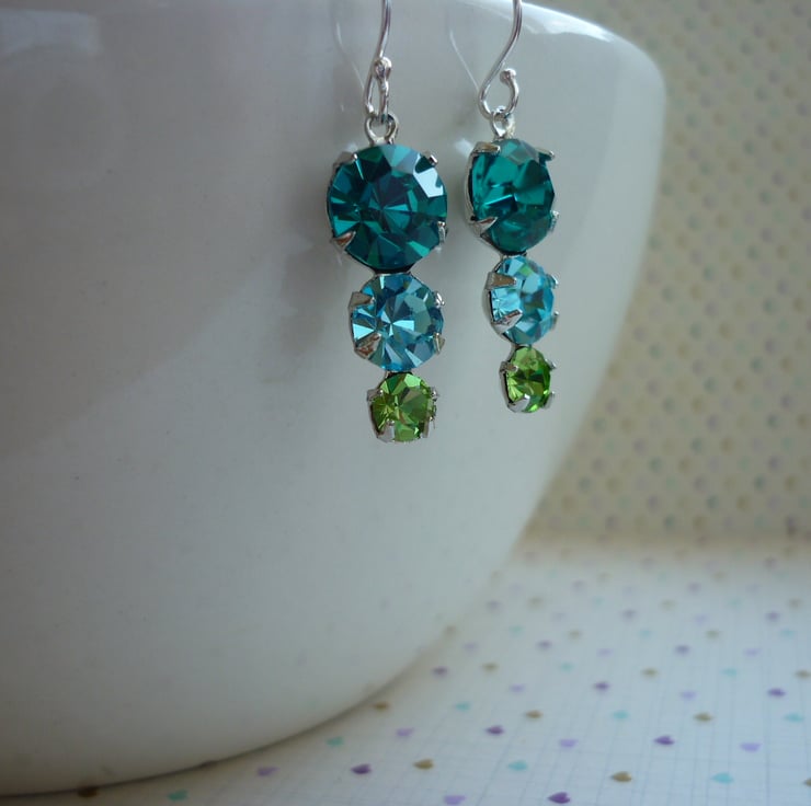 THE EARRINGS HAVE BEEN MADE WITH THREE GLASS RHINESTONES BEADS IN SHADES OF ZIRCON, AQUA AND PERIDOT GREEN SET IN A VINTAGE STYLE SETTING AND FINISHED WITH STERLING SILVER EAR WIRES.