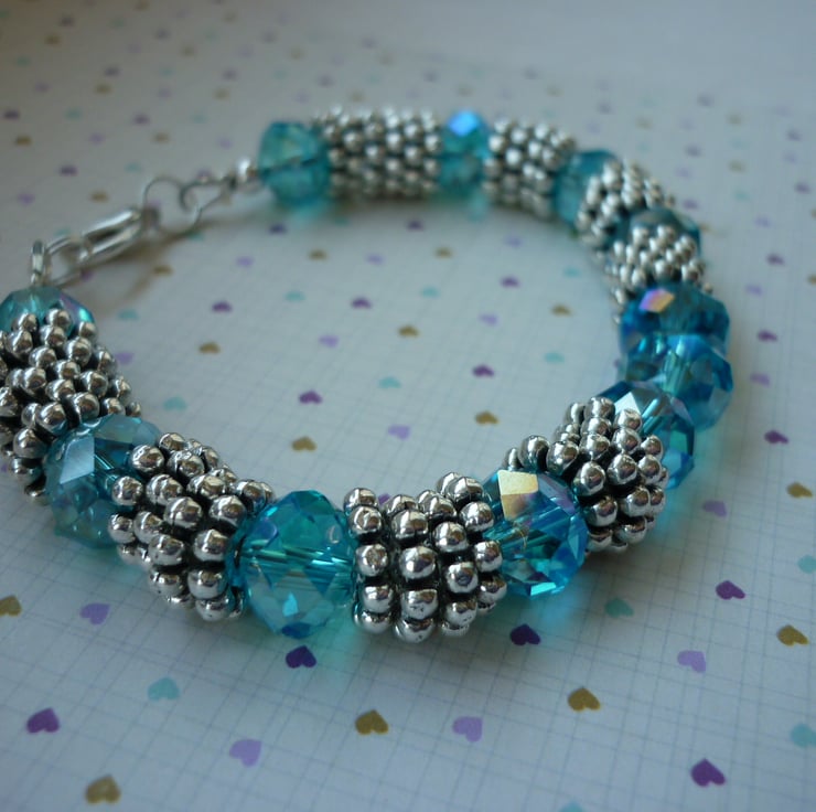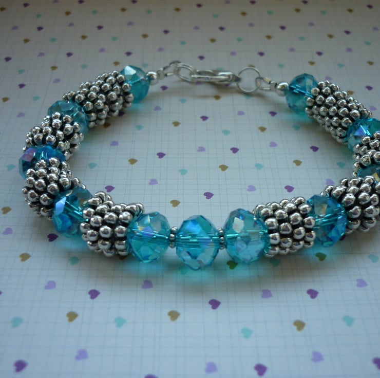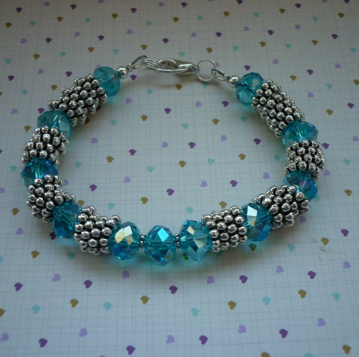 THE BRACELET HAS BEEN MADE WITH FACETED HANDCUT RONDELLE BEADS IN SHADES OF AQUA ALONG WITH SILVER PLATED DAISY SPACER BEADS AND FINISHED WITH SILVER PLATED LOBSTER CLASP AND FINDINGS.