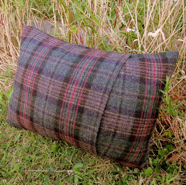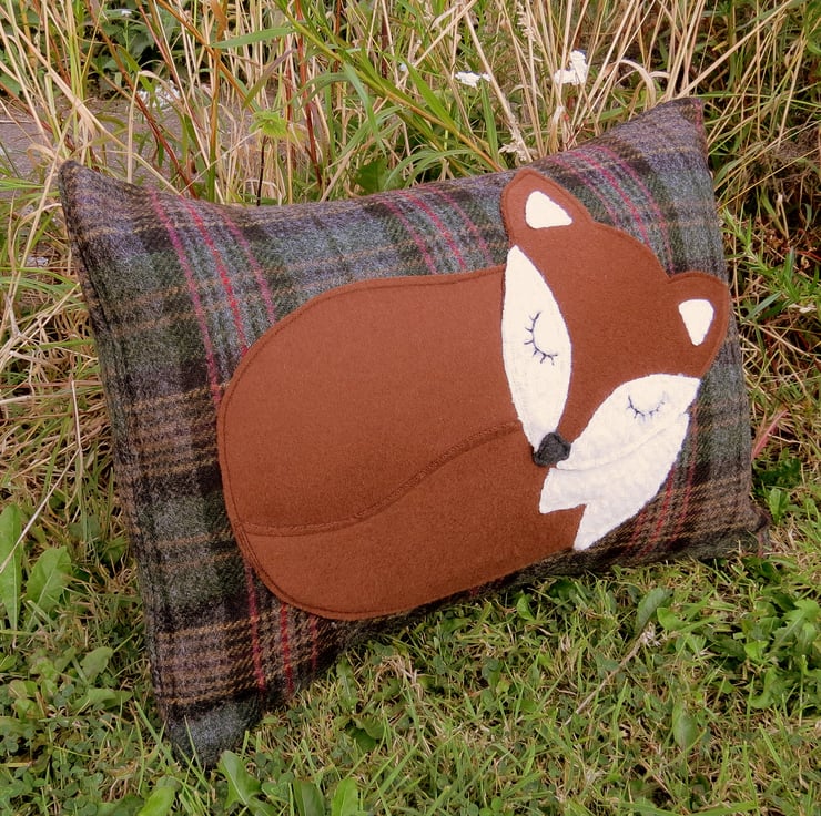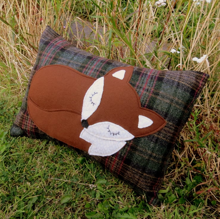 The background fabric is a tartan wool, and the fox is made from a chocolate brown wool mix fabric with cream wool accents.