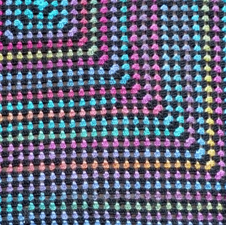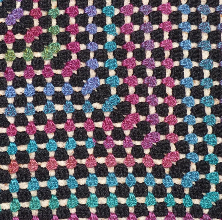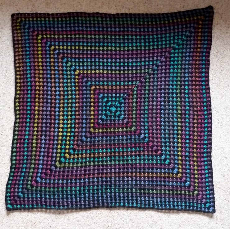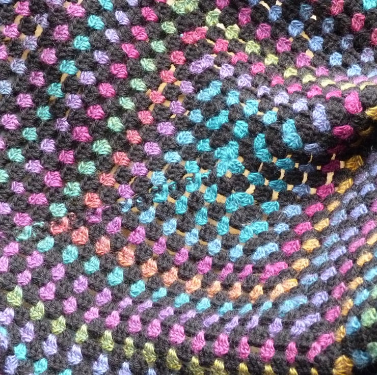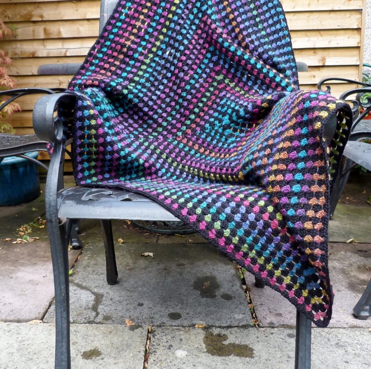 I have created this crochet blanket from two complimentary yarns. One is a multicoloured 30% wool / 70% acrylic long colour change, and the other is a black 65% wool and 35% alpaca blend. Both are approximately double knitting weight, and the alternating use of these yarns has created this stunning blanket.