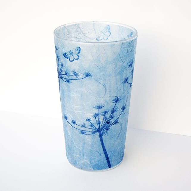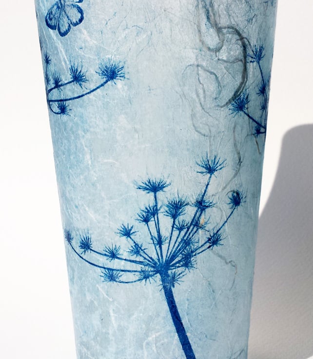 One of nature's most lovely designs Cow Parsley are captured on this unique vase. Created using the cyanotype technique on beautifully semi-translucent mulberry paper then applied to glass. It is then varnished.