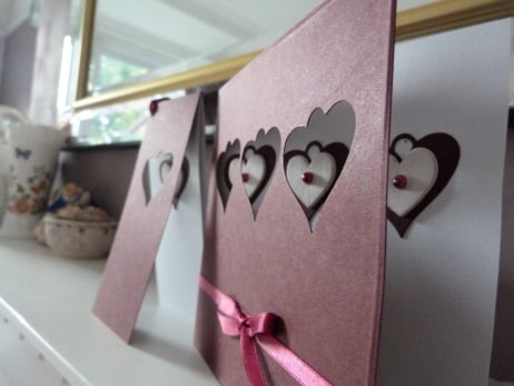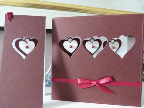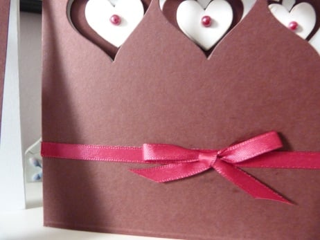 A row of three hearts die cut from quality dark red card. The hearts have been mounted onto the insert so that they show through. Each heart has a white wooden heart mounted onto it which has been finished off with a dark pink pearl bead. The edges of the card have had an embossed line all round. Finished off with a dark red ribbon and bow.