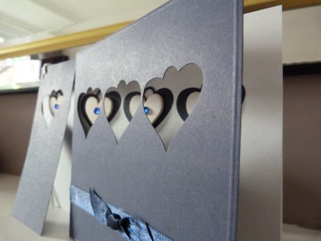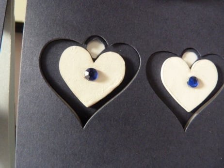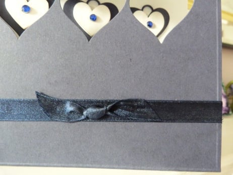 A row of three hearts die cut from quality dark blue card. The hearts have been mounted onto the insert to show through which have been decorated with white wooden hearts with a blue rhinestone centre. All edges of the card have an embossed line. Finished off with dark blue ribbon and bow.