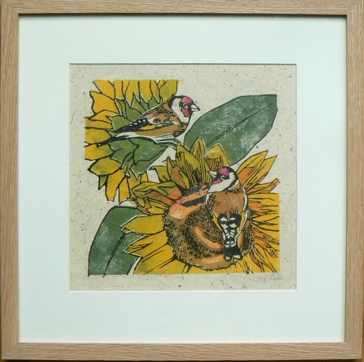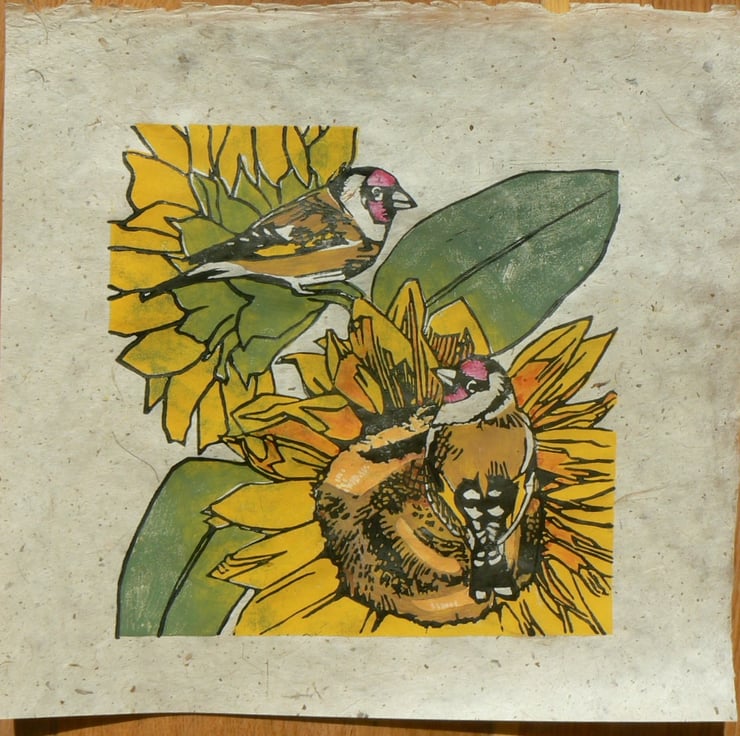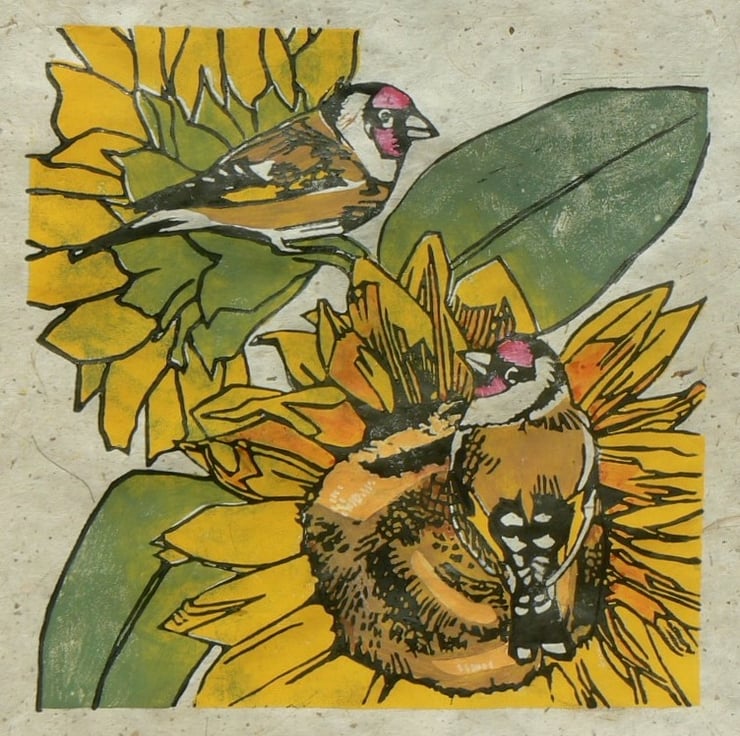 Goldfinches on the sunflowers are one of the wonderful sights I have come to expect in late summer. I have followed the same style I used to create the Wren linocut print, it is printed in two layers, with some colour added as a third layer in ink.