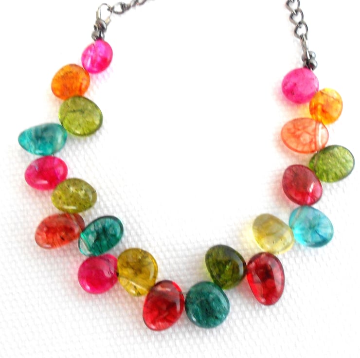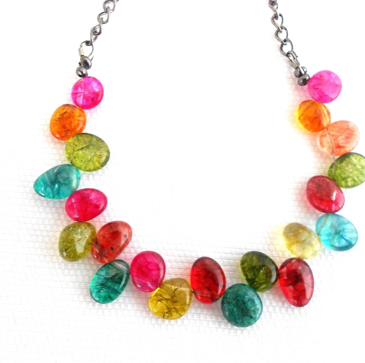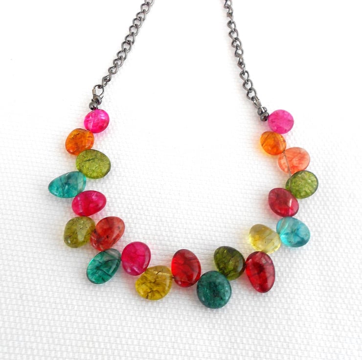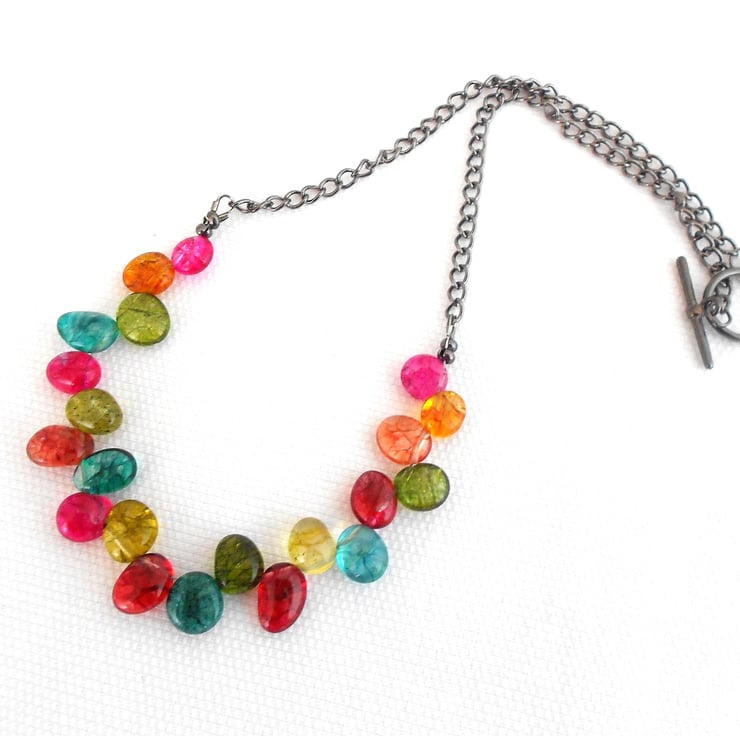 This is a lovely necklace made from multi coloured spider vein quartz top drilled flat nuggets. The nuggets measure between 8 to 10mm each. The quartz hangs from black plated chain and is finished with a black plated toggle clasp. The necklace measures 45cm (17.1/2"). As all of the items in my shop are individual pieces made by myself, this is the necklace you will receive. It will arrive gift wrapped in tissue paper and a organza bag.