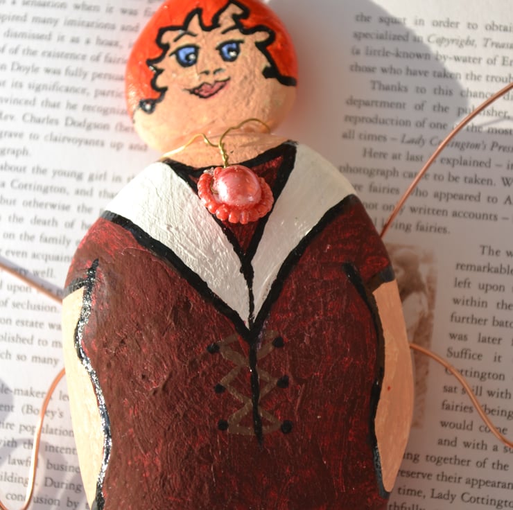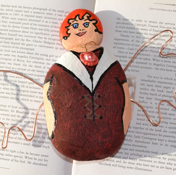 Pebbles have been painted and shaped copper wire wings added to create this delightful fairy named Maggie. Maggie has been given a necklace all of her own as even mature fairies love to look their best.