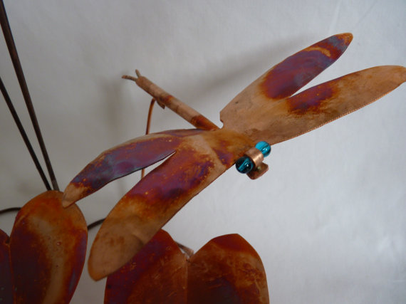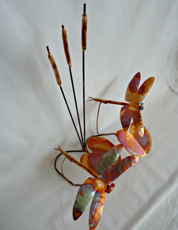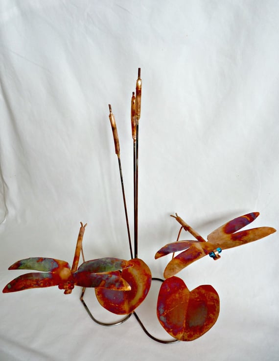 Two copper dragonflies racing across the lily pads in this decorative center piece. Flame coloured to make it stand out even more. Made from copper and mild steel.