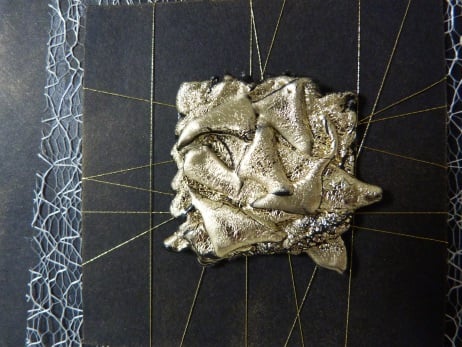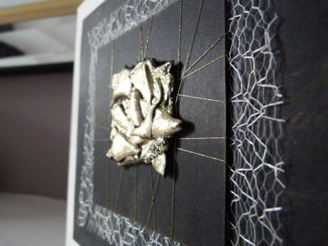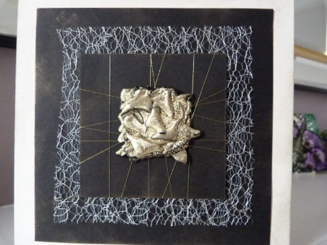 A completely handmade, unique and individually designed card consisting of a square of gold meldable plastic which has been shaped into a square with geometric shapes put on top of each other to form a really interesting shape. Mounted onto black card which has got gold thread wrapped around, then onto cream spiders web, then black card and finally onto quality cream card. All edges enhanced with gold.