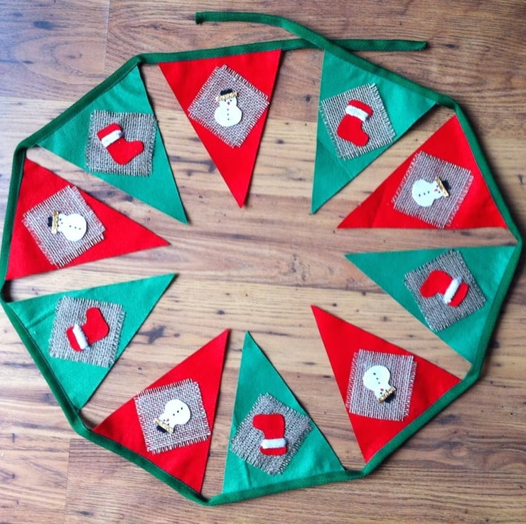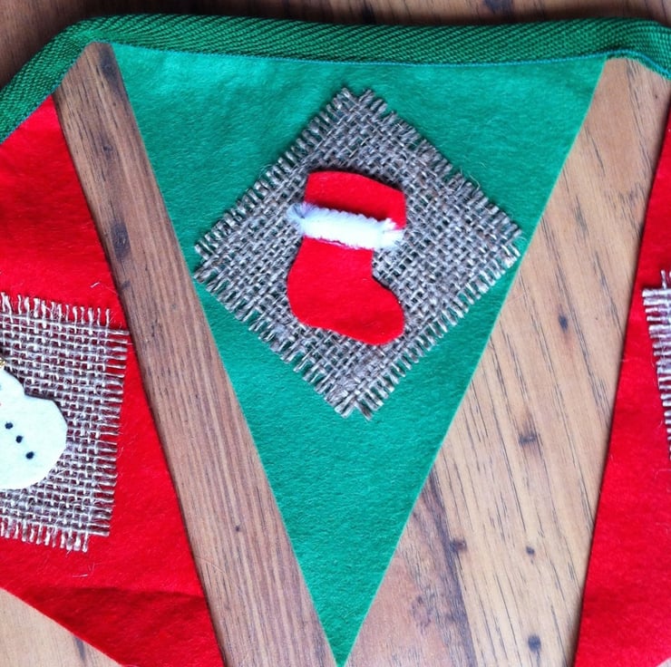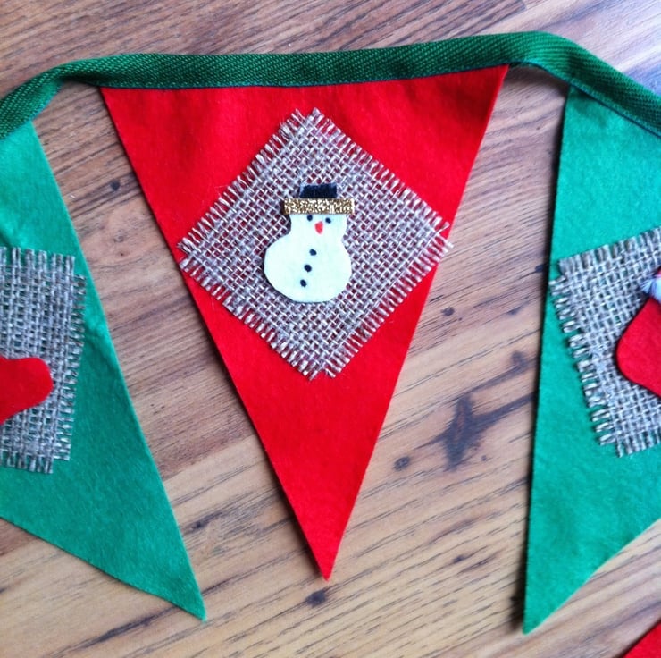 Ten pennants of alternating red and green felt each measuring approximately 15cm x 18cm. These are decorated with cute felt snowmen and christmas stockings on a background of hessian. Gold glitter detail on the snowmen's hats and white fluffy embellishment to the stockings adds extra detail. The bunting is completed using green cotton tape.