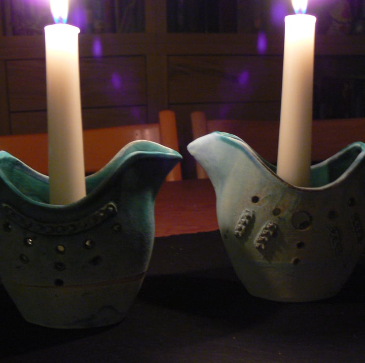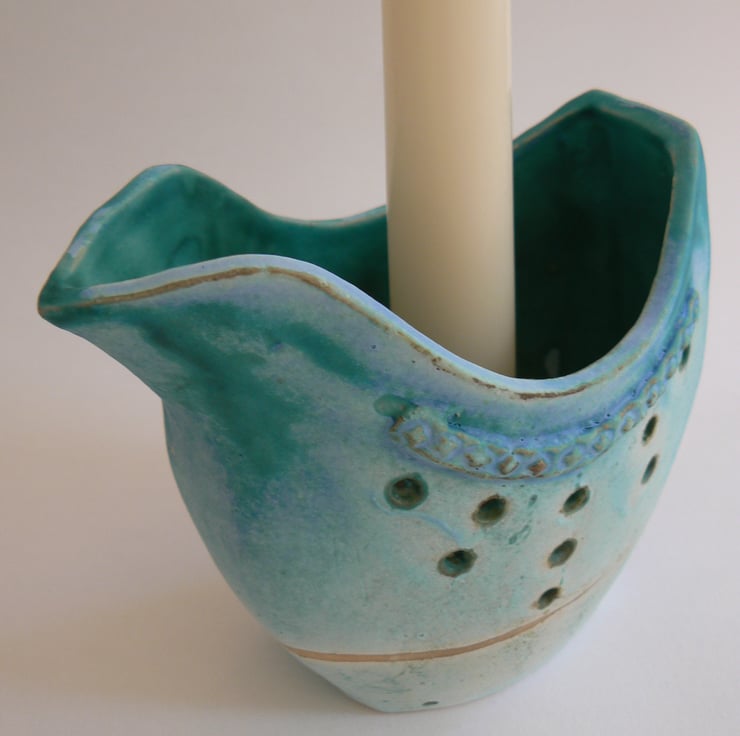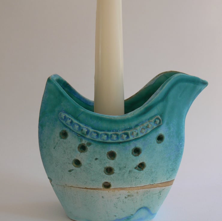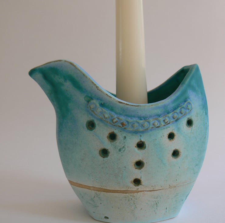 The latest creation in the Scandinavian range-a stoneware fired bird form candle holder. Glazed with a dry turquoise on the outside and a shiny white on the inside base. There is a metal sleeve to hold the candle. I have pierced holes in the bird so the candle light can shine through as it burns down.