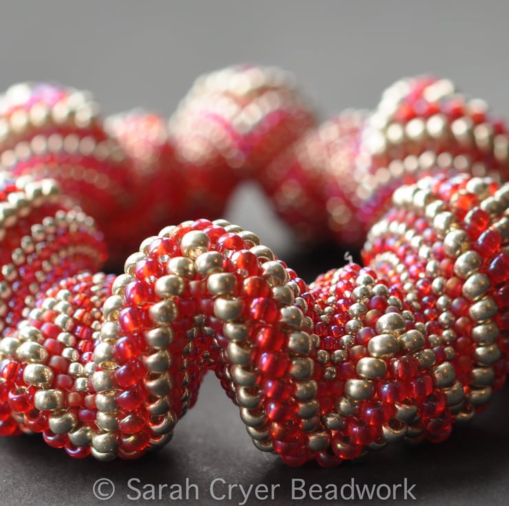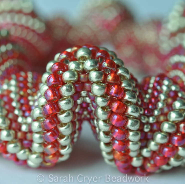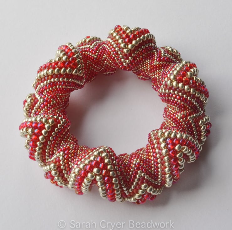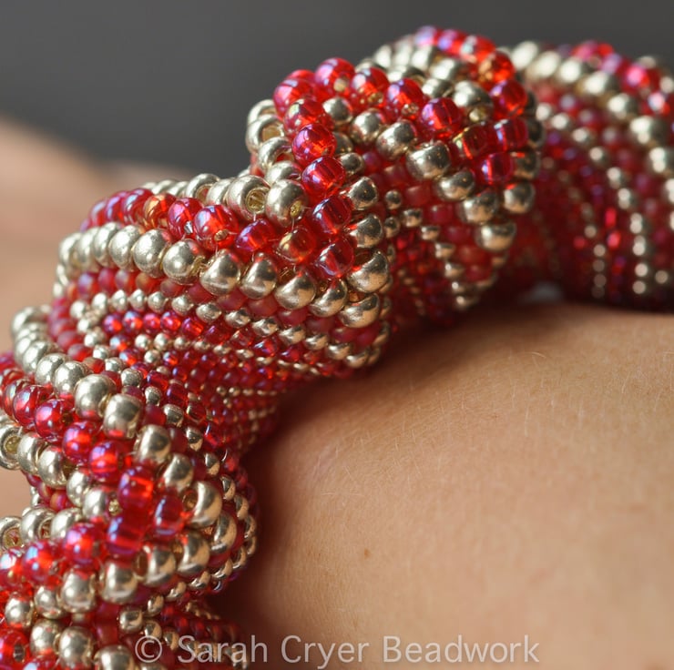 A huge and utterly fabulous beadwoven bangle in silver and pinky red seed beads ranging in size from 0.5 to 3mm. Each bead has been individually stitched into a 'cellini spiral' tube which undulates as the bead sizes change. This bangle contains around two and a half thousand beads, and measures 11cm (outside diameter), 6cm (inside diameter), 4cm (cross section), but it is flexible so will fit a small to average sized wrist.