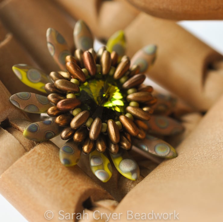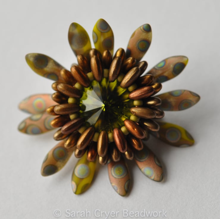 A lovely olive Swarovski crystal rivoli surrounded by circles of copper peacock dagger beads, 'rizos' (rice shaped drop beads) and copper and khaki metallic seed beads, with a silver plated brooch back.