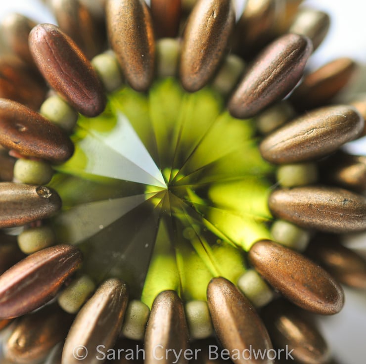 I'm a bit of a hoarder when it comes to beads, and I've been sitting on these lovely daggers for quite a while. They were expensive, and so so striking, with their fabulous peacock glaze and beautiful colours running from orange through copper to olive and even lime green. I was playing with the crystal and the new rizo beads (the rice shaped copper metallics) and created the basic bezel, and then worked a second row in behind, but it wasn't enough. Then I remembered the daggers and the piece came to life.