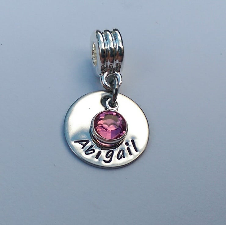 In the notes to seller during checkout please include the shape of charm you would like (circle or heart), the text to be stamped on each charm, and which crystal you would like.