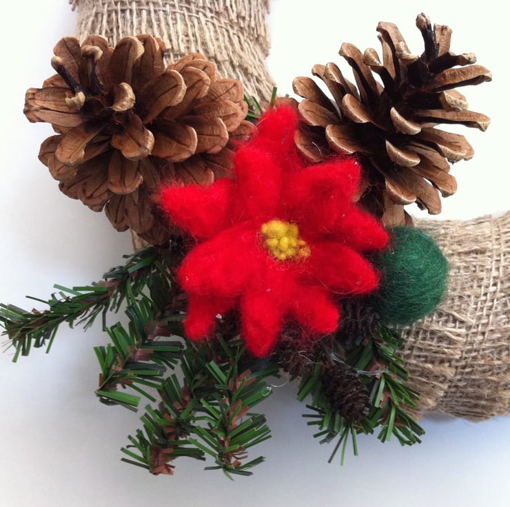 Wreaths make a lovely decoration at Christmas time and this listing is for a gorgeous 25cm rustic style wreath wrapped in natural, slightly frayed hessian with the addition of 2 pine cones, a needle felted poinsettia and a felted ball. The addition of artificial pine sprigs adds the final special touch to this wreath.