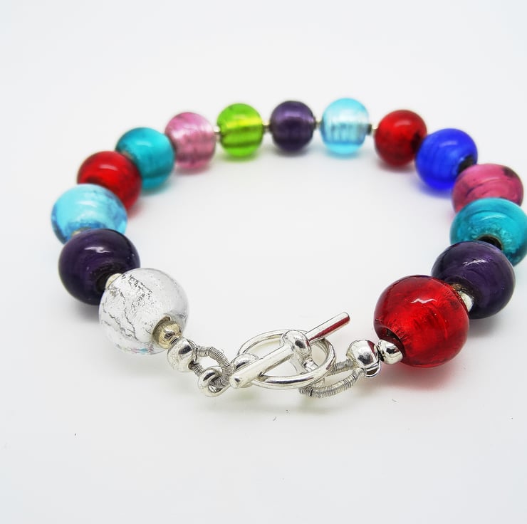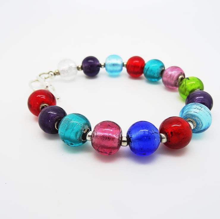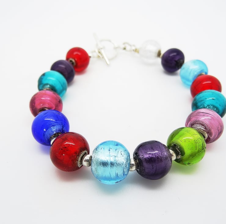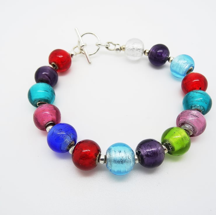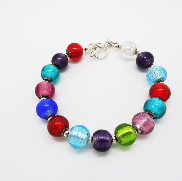 This is a lovely bracelet made from 10mm silver foiled multi coloured glass beads. The foiled beads are interspersed with 3mm silver plated spacer beads. The bracelet measures 20cm (8") and is finished with a silver toggle clasp. As all of the items in my shop are individual pieces made by myself, this is the bracelet you will receive. It will arrive gift wrapped in tissue paper and a organza bag.