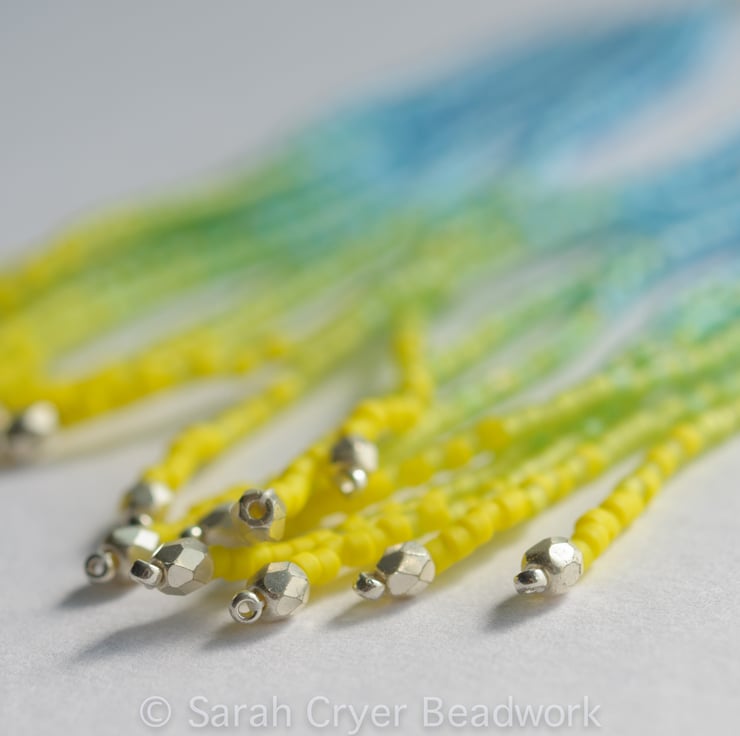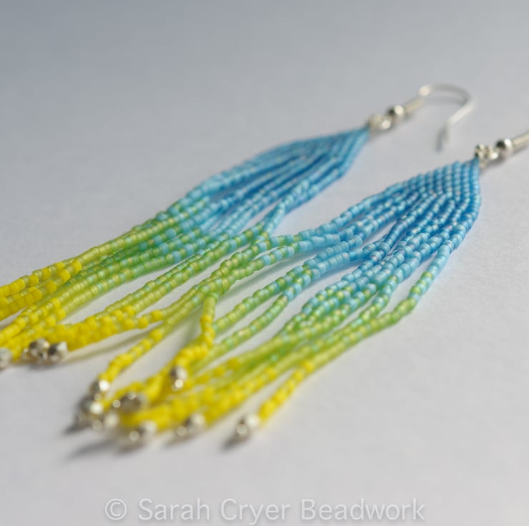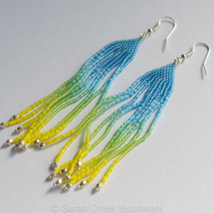 A pair of extravagent long fringed earrings in bright shades of turquoise, green and yellow. Made from tiny japanese Miyuki delicas (cylinder beads), I used brick stitch to form the top of the earring and then added a huge long fringe in graduated colours. The granduation and strands form a v shape and are tipped with a silver fire polished bead. Each earring contains over 500 tiny beads, and hangs from a silver plated earwire. They are 1.5cm wide and 11cm long (measured from the top of the ear wire).