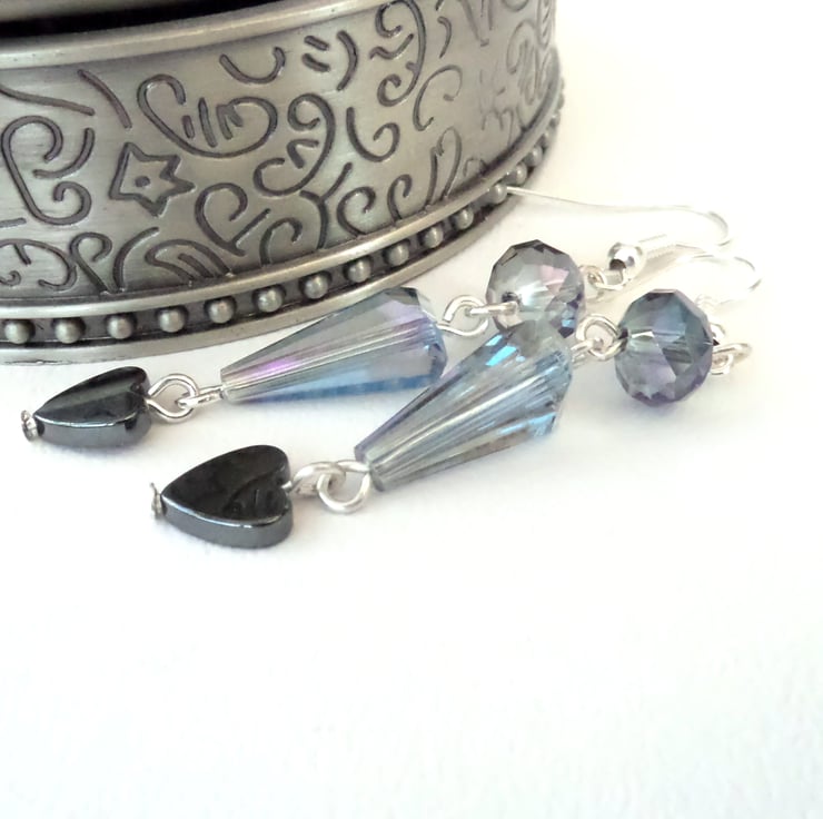 A unique pair of earrings with a mystic blue crystal rondelle and an unusual teardrop crystal.