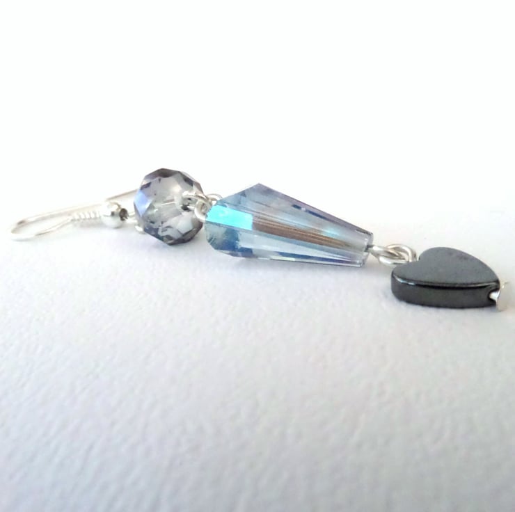 A unique pair of earrings with a mystic blue crystal rondelle and an unusual teardrop crystal.