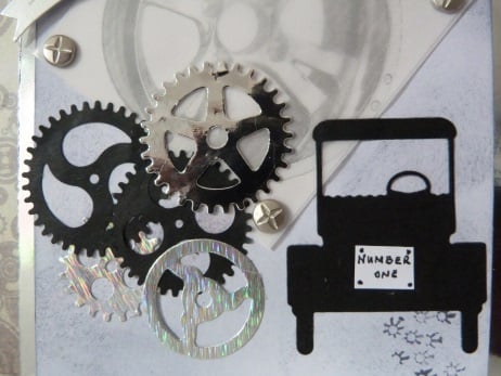 A vintage car die cut from black card mounted onto grey shaded white card. Further embellished with an assortment of cogs die cut from silver, black and holographic silver card. An alloy wheel has been printed onto vellum and held in place by four silver screw topped brads. Mounted onto silver mirri card then onto cog patterned paper then onto quality dark blue card. Finished off with a Happy Birthday banner