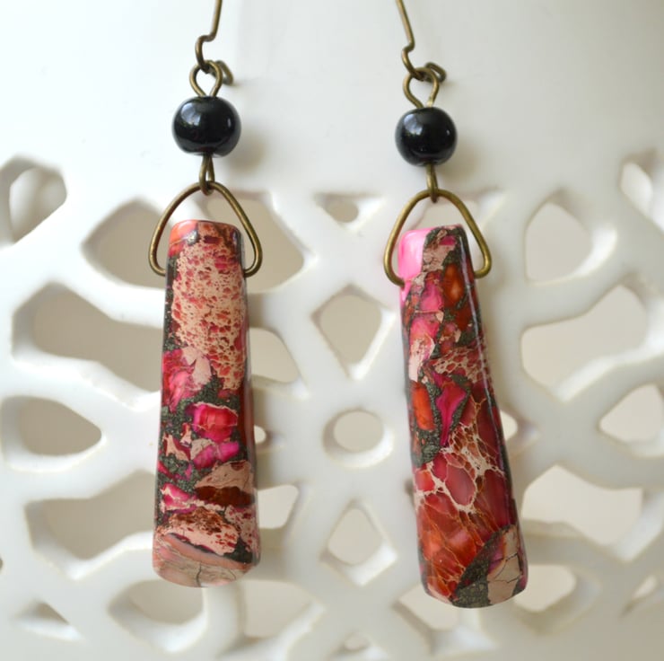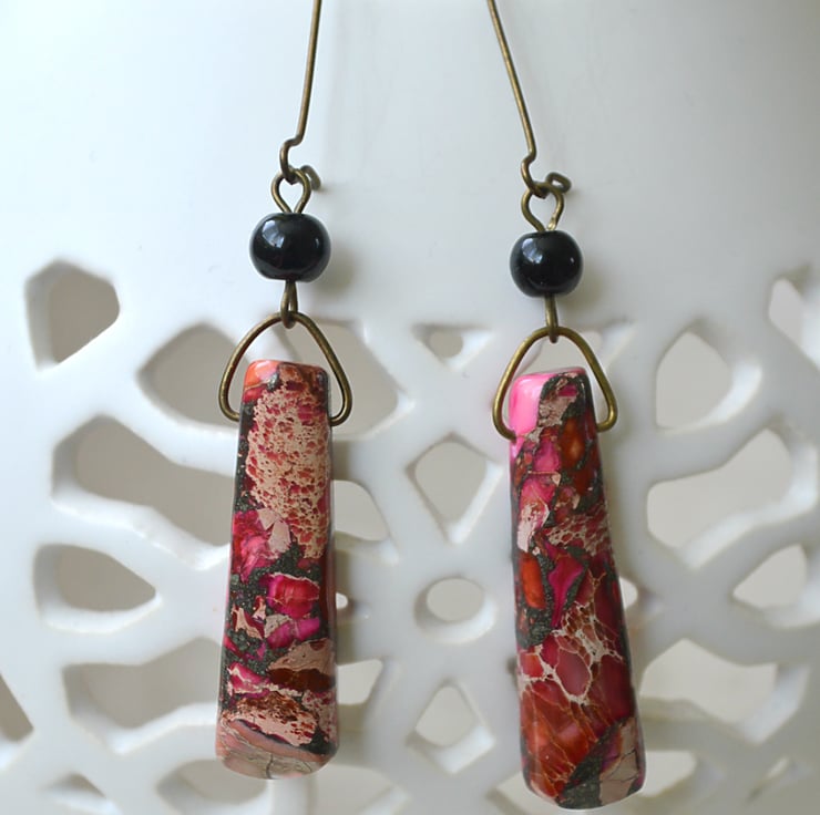 Gorgeous earrings with pink Sea-sediment Jasper beads and antique bronze findings.