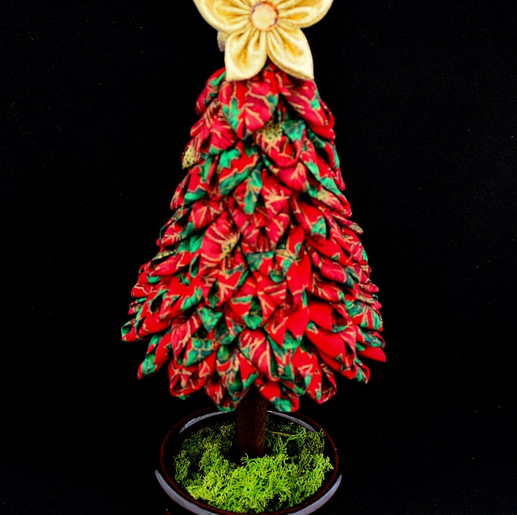 This Christmas tree is handmade using a 12cm polystyrene cone, small sequin pins and a festive fabric in Red, Gold and Green (Other Colours can be made, see below of a few samples). Its then been attached to a piece of doweling which I have painted brown to represent the Christmas tree trunk. This is then set in a pot of Plaster of Paris and then added is Green moss. (POT MAY DIFFER TO ACTUAL PICTURE DUE TO AVAILABILITY).