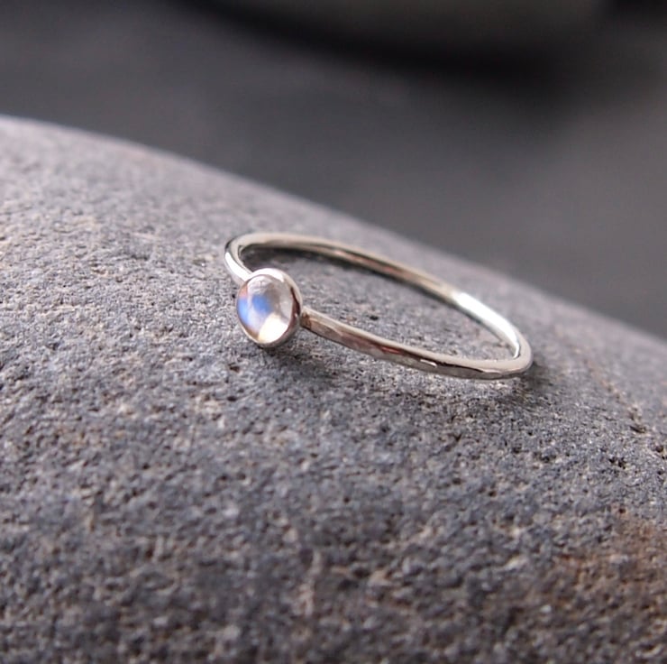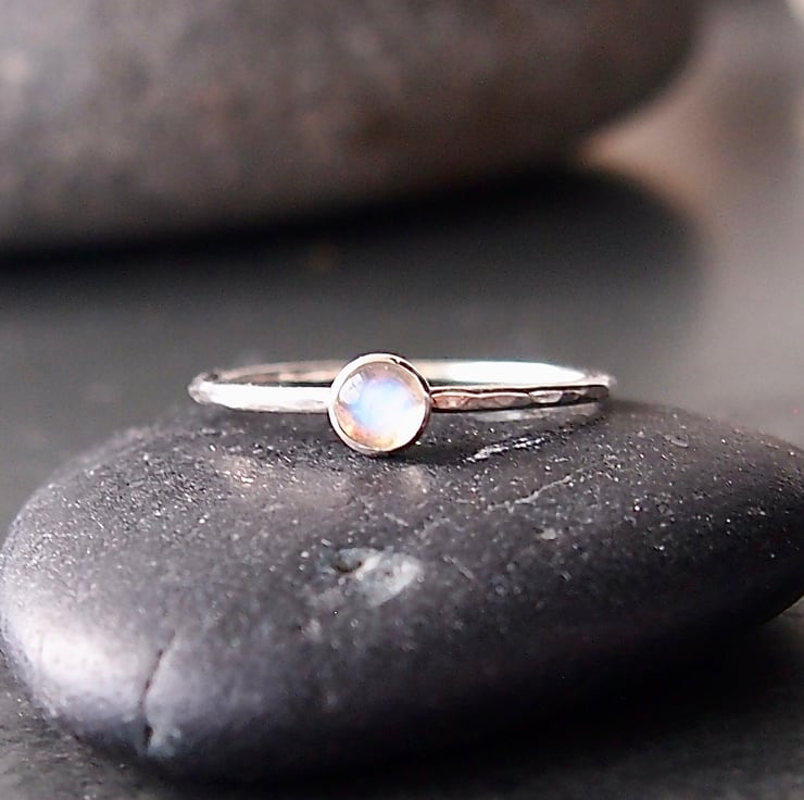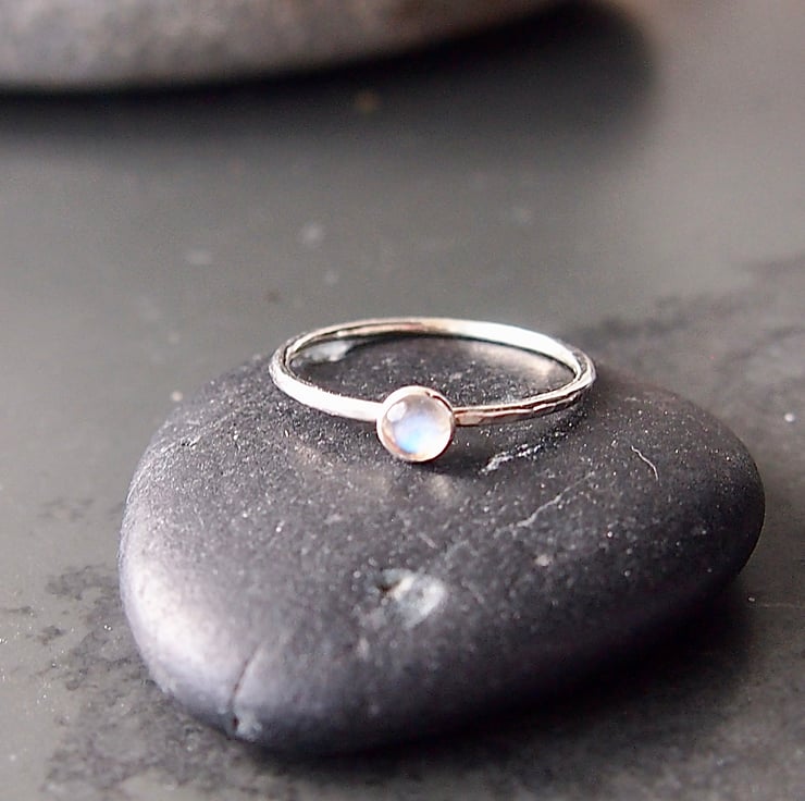 A 4mm rainbow moonstone cabochon is set onto a skinny band which has been gently hammered for texture. Beautiful flashes of blue occur when the stone catches the light.