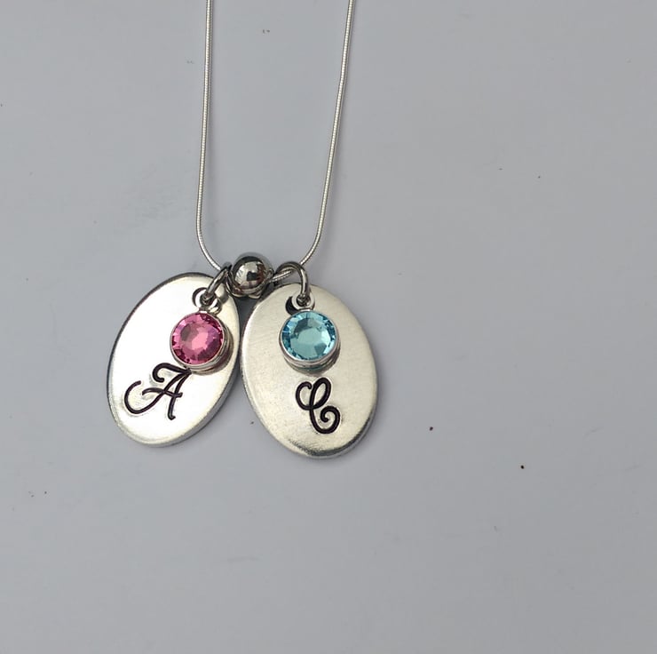 In the notes to seller during checkout please include the initials you would like stamped onto the oval and which birthstone you would like.
