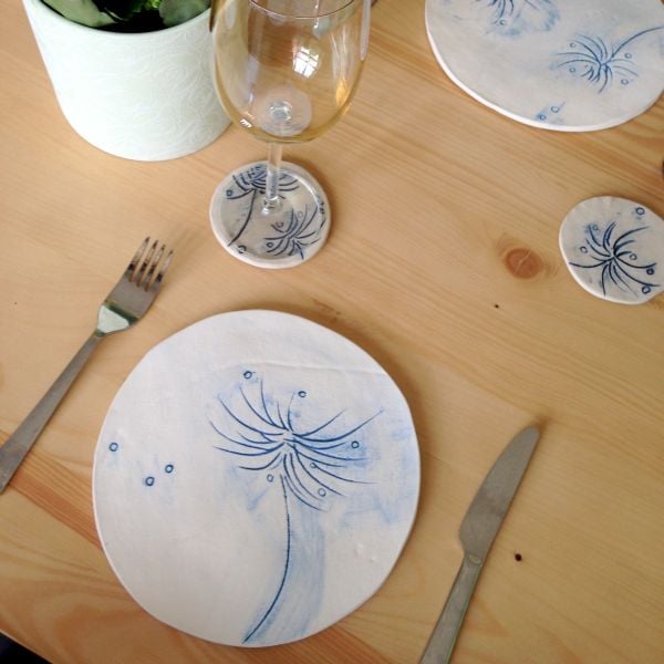 This set of four round handmade ceramic place mats each have a unique hand-engraved blue dandelion design on the surfaces.