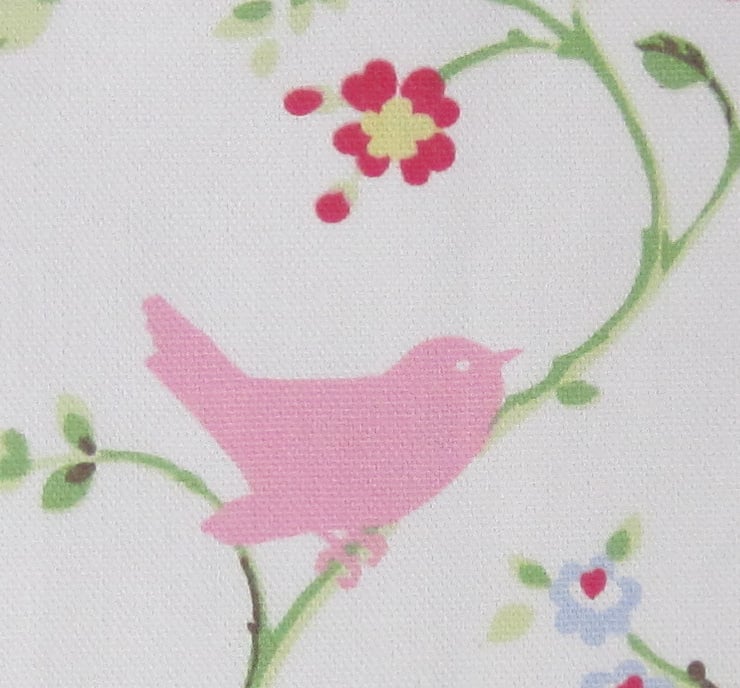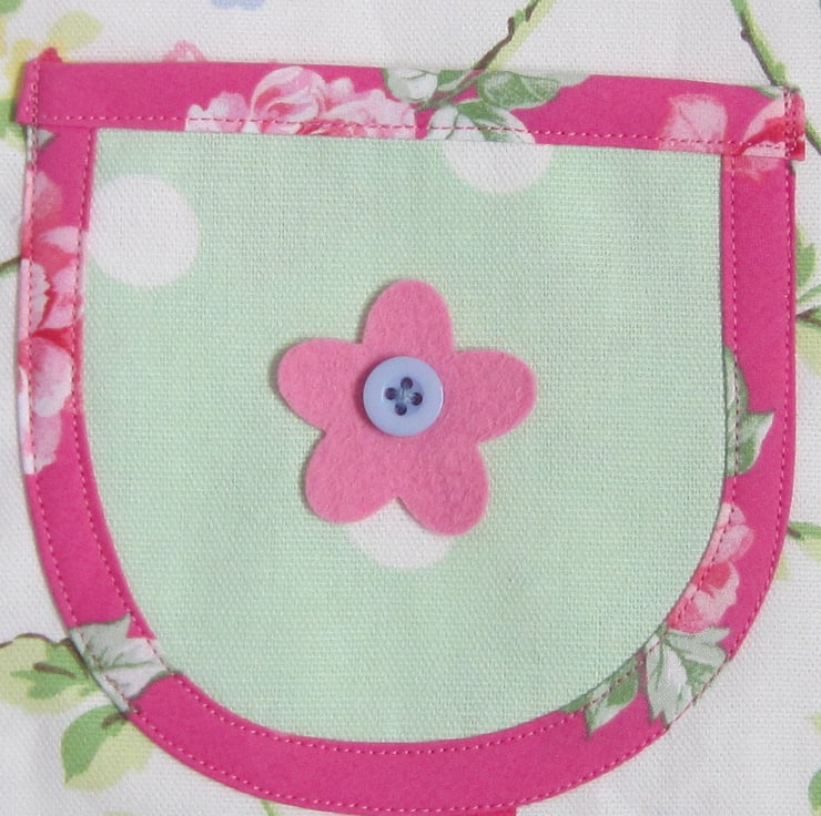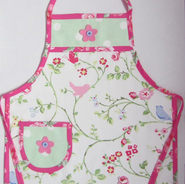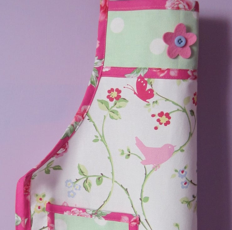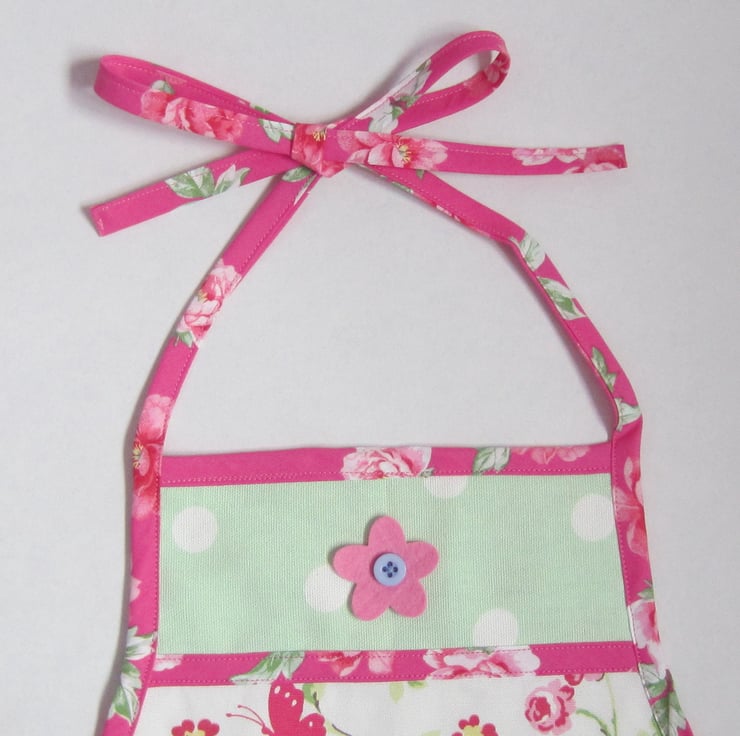 Pretty apron made from bird, butterfly and flower fabric with pale green and white spot top panel and pocket with pink felt flower and blue button embellishments. Edged with dark pink floral bias binding. Suitable for a little girl aged about 4 to 6 years old. It measures 40 cm wide and 53 cm long. Fastens with a bow at neck and waist.