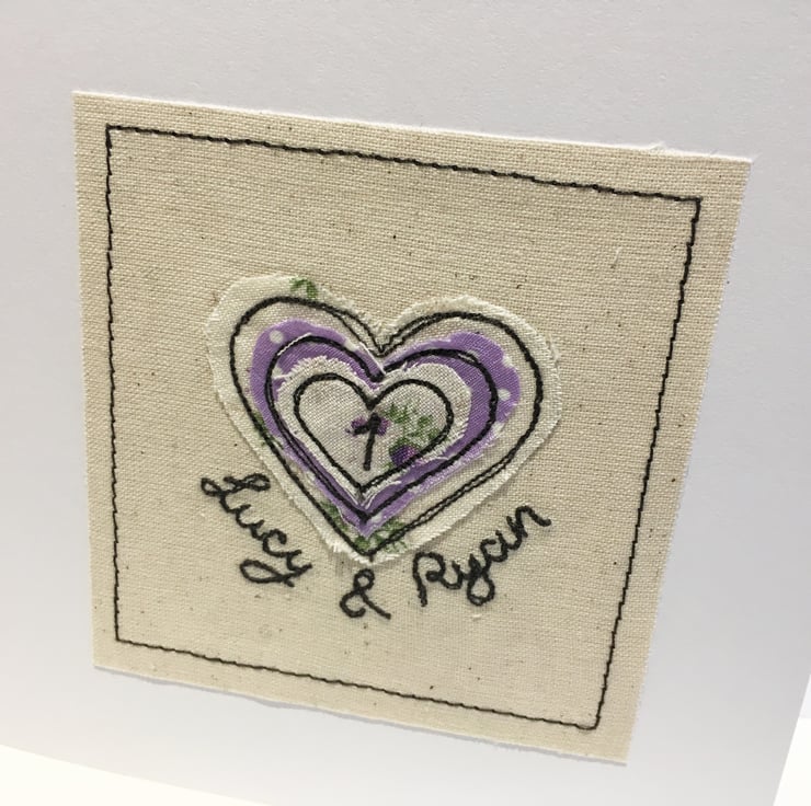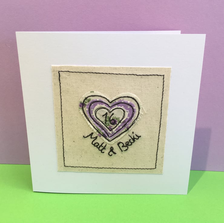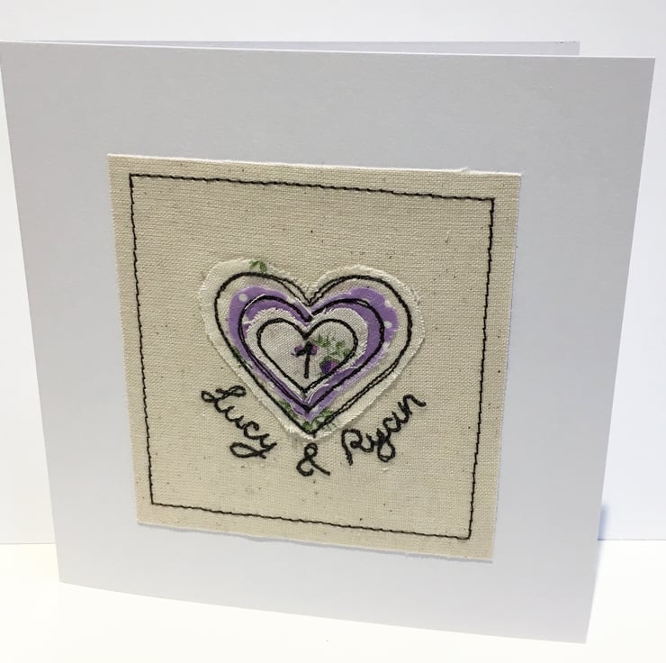 This beautiful Wedding anniversary card is made up of three simple fabric hearts machine embroidered one on top of the other with the names of the couple around the heart and the number of years they have been married in the centre of the heart.