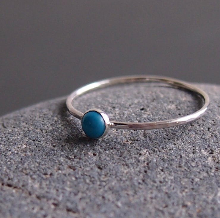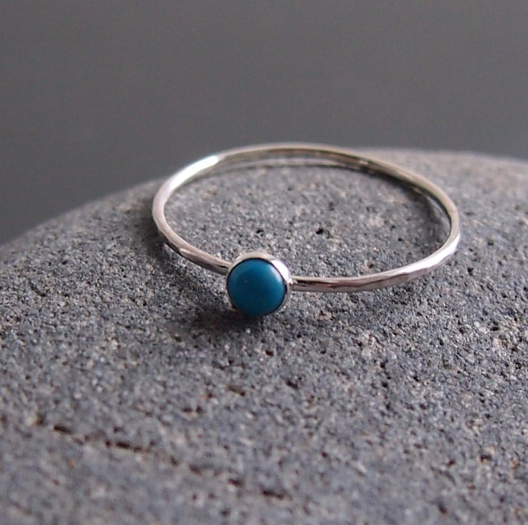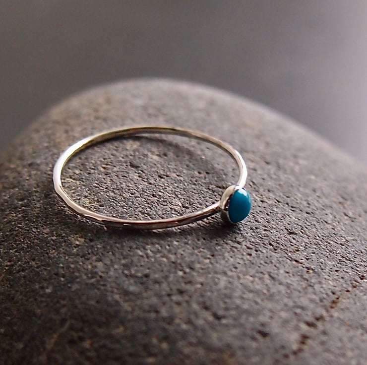 A 4mm turquoise cabochon is set onto a skinny band which has been gently hammered for texture..